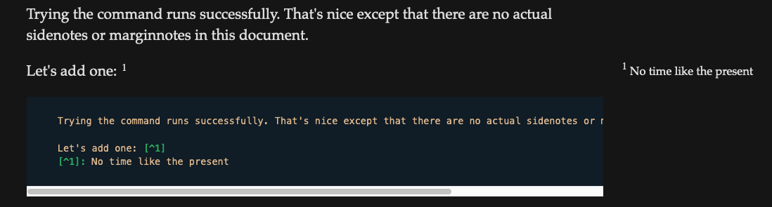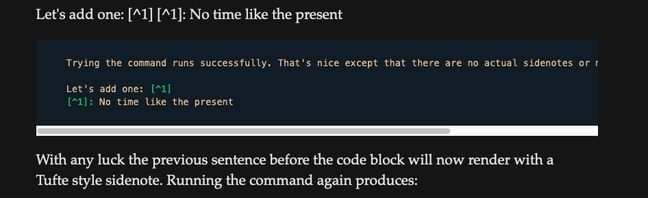 [^1]: No time like the presentWith any luck the previous sentence before the code block will now render with a Tufte style sidenote. Running the command again produces: