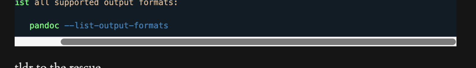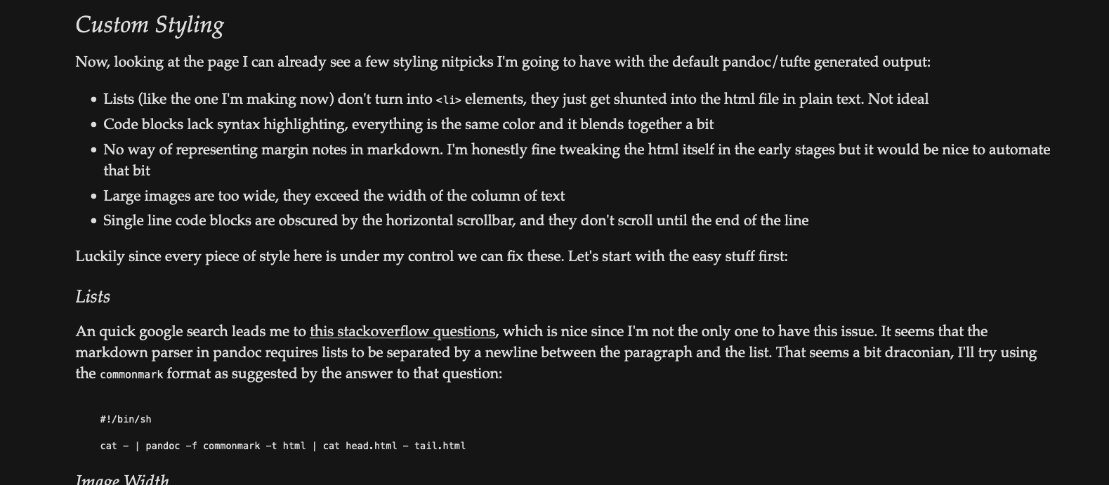 Lists don’t turn into=> Include a newline between the list and the previous line, or use commonmark<li>elementsCode blocks lack syntax highlighting=> Solved with pandoc extensionNo way of representing margin notes in markdown.=> Solved with pandoc extenstionLarge images are too wide=> Structure the page the way tufte css expectsCode block scrollbar issues=> Use thescrollbar-colorcss attribute and some pseudo-classes to styleBlockquotes need more distinct styling=> Done with the above customizations.