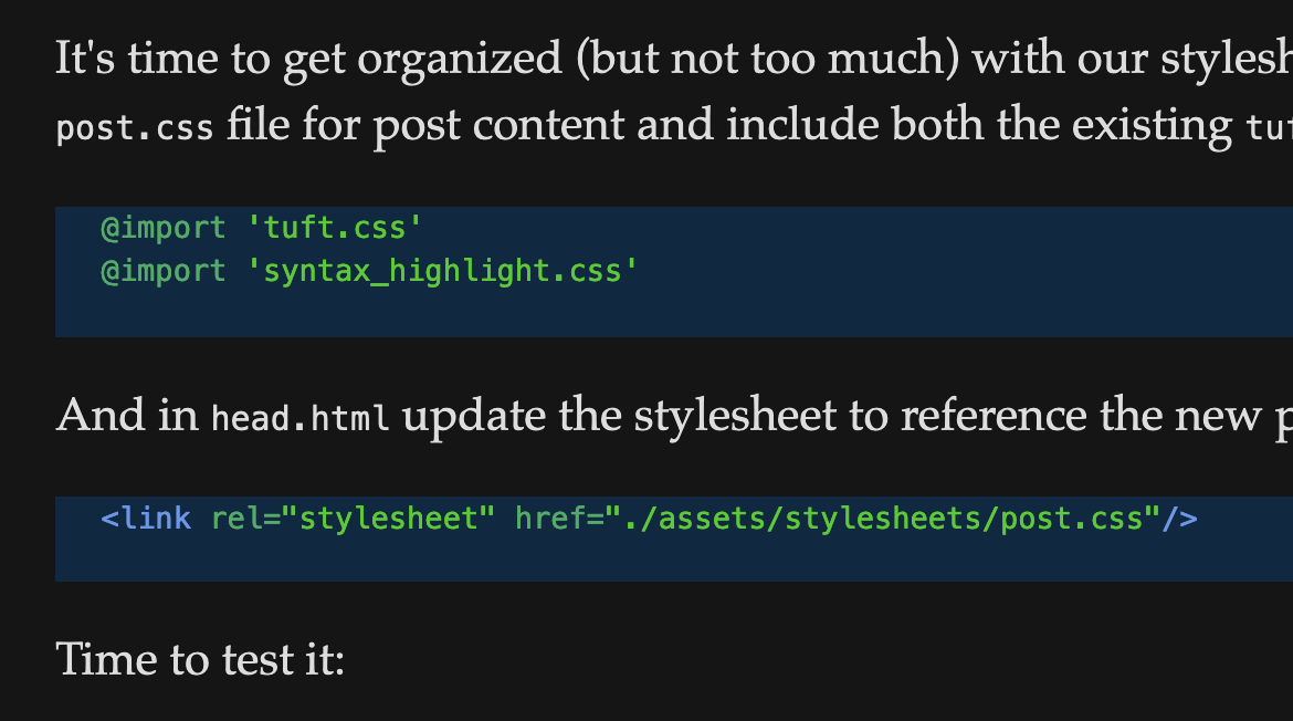 It’s time to get organized (but not too much) with our stylesheets so I’ll create a new post.css file for post content and include both the existing tufte.css in it: